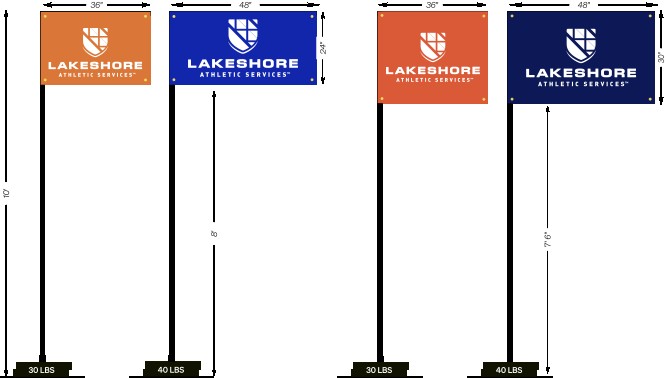 “H” Poles are free standing sign holders that are typically used for mile markers on the course or site maps. They have two feet and are held in place by heavy weights. The 6′ H-Pole is the most commonly used. The taller H-Poles are more likely to get knocked over in heavy winds. 30″x 30″ signs are recommended for the 6′ H-Pole and 36″ x 24″ signs are recommended for the 7′, 8′ and 10′ H-Poles.